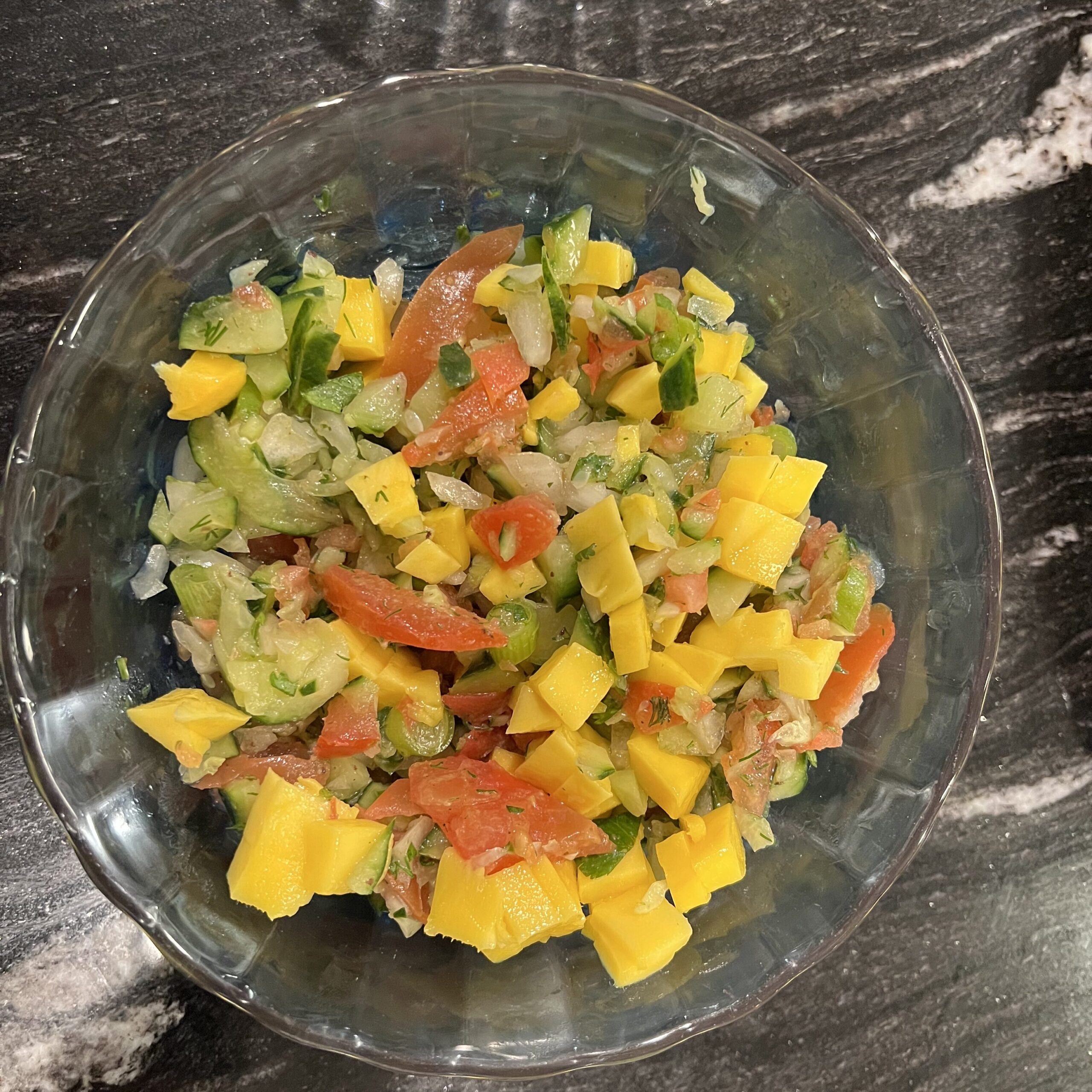 This modified Israeli salad with mango is a great dish to incorporate summer nutrition guidelines and is quick and easy to make!